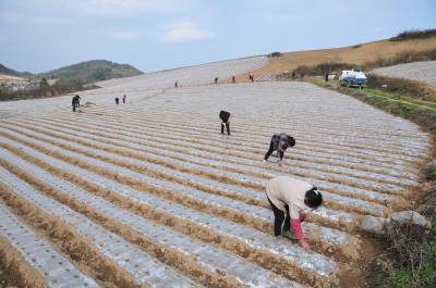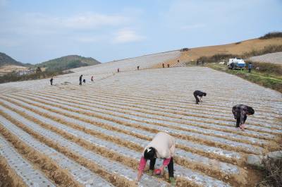 4月9日,在恩施市板桥镇大山顶村高山蔬菜种植基地,大山顶蔬菜种植合作社社员们正在起垄种高山萝卜。