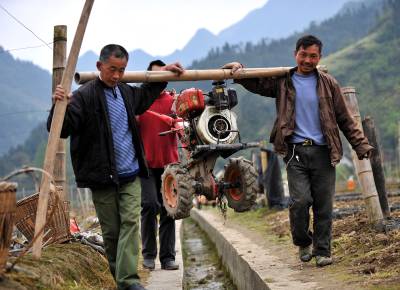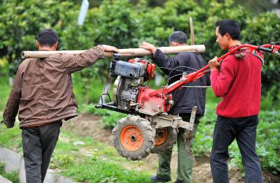 9日,宣恩县高罗乡埃山村的三位农民抬着耕整机进田地。恩施州山大人稀,沟壑纵横,这给现代农业工具、特别是农机的使用带来了极大不便。但随着国家农村补贴、良种补贴等一系列惠民政策的出台,激发了农民种田热情。仅宣恩县,去年新增农机具3000余台(套)。(视界网签约摄影师:宋文摄)