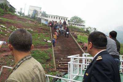 4月11日放周假,巴东县官渡口小学值班老师正在护送学生上船回家。 自2001年秋季长江三峡库区水位上涨后,官渡口小学每天都需护送学生乘船。值班老师按照各班班主任清点的乘船学生进行再清点,准确不误地护送上船,交给船主。船主清点后确认,再签字。该校采取“三清点 三交接”,十多年来,无一意外事故发生。(通讯员向国大摄)