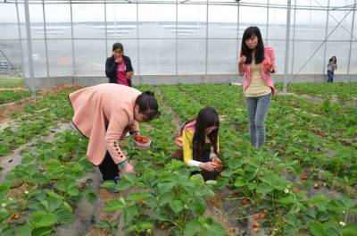 > 大棚草莓红 游客乐采摘
