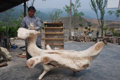4月11日,水布垭镇山里来旅游产品开发有限责任公司的总经理曾维创正在打磨“龟龙”木雕制品`。曾维创将大山里的树兜购回公司后进行精雕细琢,加工成各种适用的家居用品,并通过网上电子商务等途径畅销国内外,每年创收产值百万元。本报视界网陈美强摄