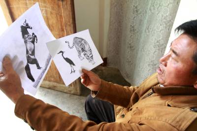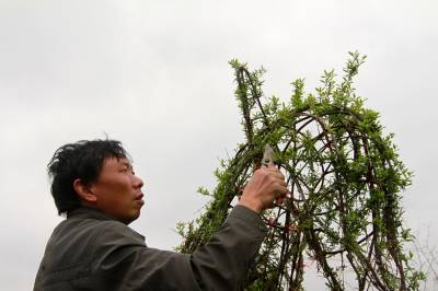 4月13日,房县军店镇何家村民间艺人向清贵在植物“动物园”修剪孔雀。这家植物“动物园”在鄂西北地区尚属首家,全国实属罕见。