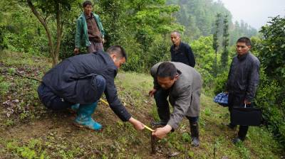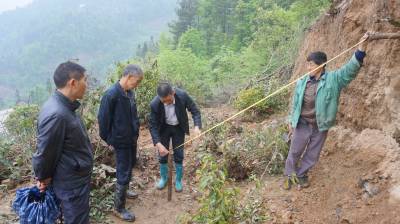 4月14日,巴东县金果坪乡国土资源所的工作人员正在江家村7组鲜家坡地灾点指导监测员采用定点打桩法观察地灾点的变化情况。