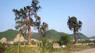 在丁家营镇平整宽阔的工业园区一角,就是当地小有名气的生态园。放眼望去,各种造型别致,郁郁葱葱、花团锦簇、琳琅满目的名花异木令人目不暇给,而在通向生态园区的路口,两棵高大挺拔的大树一下子映入眼帘。树干笔直粗壮,虬枝曲盘、翠叶舒展,树冠蓬松,其中一棵更加高大伟岸的古柏似曾相识。那不就是笔者要找的古柏么(图左)!