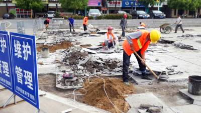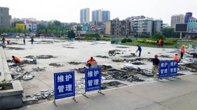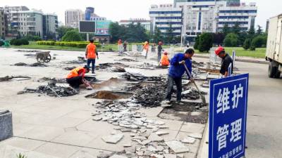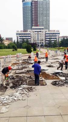 17日,工人正在云梦县人民政府广场加紧维护破损的大理石地面。连日来,该县组织城管、市政建设等部门着力改善公共设施,对城区所有破损路面和市民公共活动场所的设施进行维护,给市民创造一个优美、舒适的宜居环境。 王云清 摄