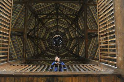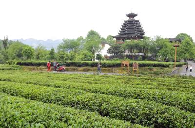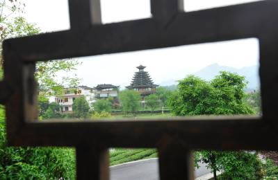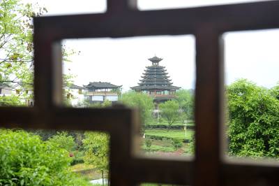 4月20日,一位游客在湖北省恩施市芭蕉侗族乡的鼓楼上看风景。(游客从恩施市芭蕉侗族乡鼓楼旁经过、拍摄的湖北省恩施市芭蕉侗族乡鼓楼。)