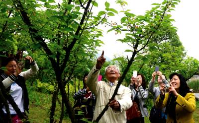 黄石市雷越常老人与女儿及女儿的同学一起在该市磁湖北岸喜看樱桃挂满硕果。