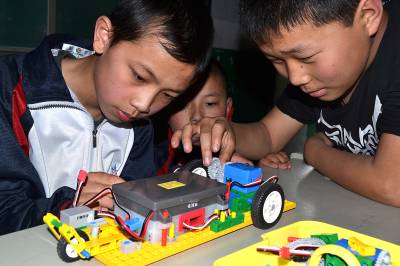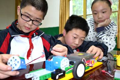 4月21日,郧县茶店小学学生正在少年宫科技活动室专心组装机器人。郧县茶店、柳陂等乡镇已建成4所乡村少年宫。通过声、光、电等科普实践,形象地展示高新技术的应用,为留守儿童营造崇尚科学、热爱科学的氛围,乡村少年宫已成为农村娃儿们求知的“乐园”和 “港湾”。 (本报视界网 曹相聪 王伟)