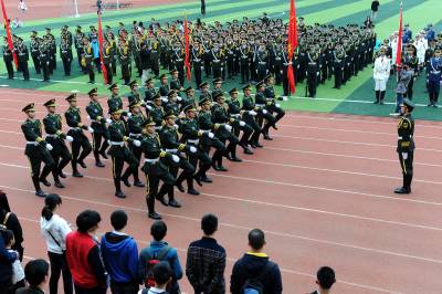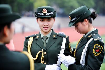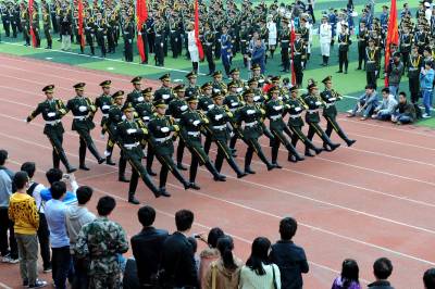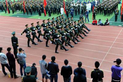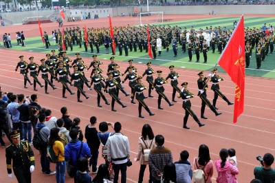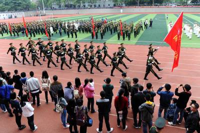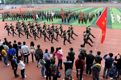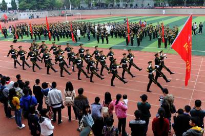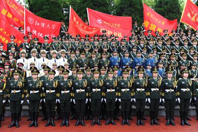 2014年4月20日,来自湖北经济学院、华中师范大学、华中科技大学等武汉地区的16所高校的国旗护卫队,身着海陆空和武警军装在中国地质大学(武汉)集体亮相,通过会操阅兵式正步走出青春风采。