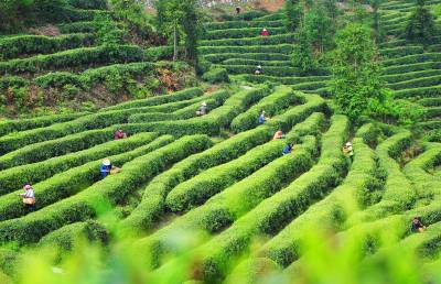 4月22日,三五成群的采茶工正在湖北金果茶业铧烨分公司茶叶基地采摘茶叶。 近年来,巴东建成4.2万亩生态茶叶基地。蓝天白云下,茶树翠绿、茶叶飘香,茶垅似绿飘带缠绕山间,采茶工指尖飞舞,像在拨弄一把大琴弦,美妙的音符流淌在山间。
