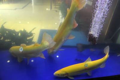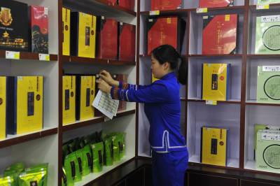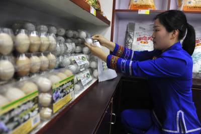 4月22日,在湖北省恩施市一硒产品专卖店,工作人员展示贴有“硒标”的富硒产品。