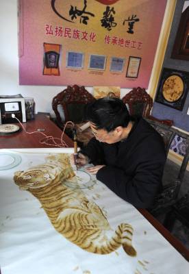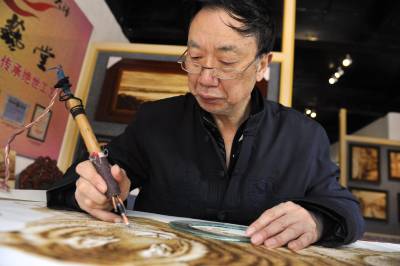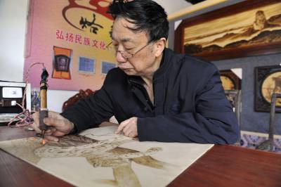 制作烙画传承土家文化 4月22日,湖北省工艺美术大师赵平国用烧红的烙笔创作烙画。 恩施土家族工艺美术大师赵平国,1997年开始潜心钻研烙画,自创新技法、新工艺,用电烙铁、烙画笔在木板、丝绢上创作反映土家族历史文化、风土人情、自然风光的烙画。17年来赵平国创作了田氏土司群像、大型壁画《土家风情》、《容美纪游》等两百多幅作品。 视界网 谢顺 摄