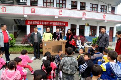 捐赠活动中,新好国际教育集团向木栗园小学捐赠了5000元现金,为48名学生定做春秋装校服,爱心使者还带来了2000多元的图书和体育器材。为天明希望小学附属幼儿园送来了48英寸大彩电、45套夏装、学习用品、小飞机模具。