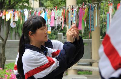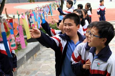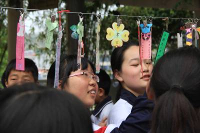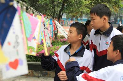 4月23日,十堰市第十八中学学生在欣赏同学们制作的精美书签。全民阅读月,该市中小学校举行经典诵读、图书分享、读书主题演讲等活动,让学生亲近图书,培养良好的读书习惯。