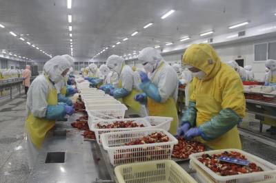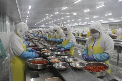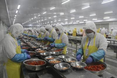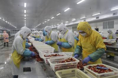4月23日,湖北楚玉食品有限公司生产车间内600多名工人正在紧张有序地剥虾仁。沙洋县水域面积达40万亩,沿湖沿库冷浸低洼地20余万亩,水田78万亩,发展小龙虾产业具有得天独厚的条件。该县以湖北楚玉食品有限公司等水产品加工企业为龙头,充分挖掘水资源优势,把小龙虾产业作为支柱产业、创汇产业、富民产业来抓,全力推进小龙虾产业突破性发展。目前,全县小龙虾养殖面积达18万亩,实现年产量2.5万吨,年出口创汇7000多万美元,带动全县农民人均增收120元。本报视界网何长青摄