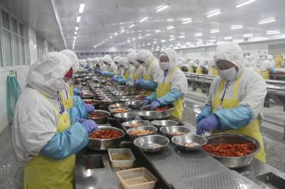 沙洋县将“小龙虾”做成大产业 4月23日,湖北楚玉食品有限公司生产车间内600多名工人正在紧张有序地剥虾仁。沙洋县水域面积达40万亩,沿湖沿库冷浸低洼地20余万亩,水田78万亩,发展小龙虾产业具有得天独厚的条件。该县以湖北楚玉食品有限公司等水产品加工企业为龙头,充分挖掘水资源优势,把小龙虾产业作为支柱产业、创汇产业、富民产业来抓,全力推进小龙虾产业突破性发展。目前,全县小龙虾养殖面积达18万亩,实现年产量2.5万吨,年出口创汇7000多万美元,带动全县农民人均增收120元。本报视界网何长青摄 通联:沙洋县新闻中心何长青13972901616邮编:448200