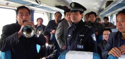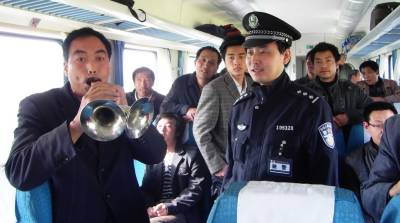 罗超【通讯员罗超】4月10日,K279次旅客列车14号硬座车厢一位身带双管唢呐的旅客汪某(男,38岁,湖北十堰郧西县人),趴在茶几上睡着了。乘警上前叫醒了他,并给他提供一个表演平台,在众旅客的掌声中,汪某相继演奏了《南泥湾》和《祝你平安》。大家顿时精神振奋,消除了困意,做到了平安旅行。图为乘警搭台让旅客唢呐声声奏平安时的场景。
