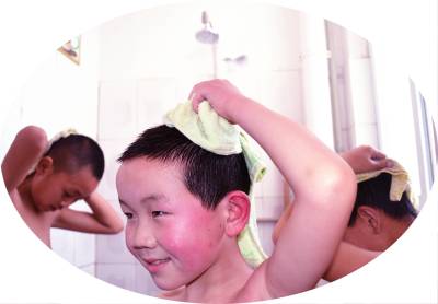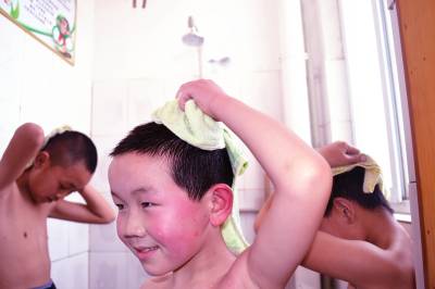 (图1、2):4月24日,湖北省郧县柳陂镇中心小学学生张旭和两个同学正在开心地洗热水澡,学校后勤服务标准化了,一天一个热水澡,“爽!”