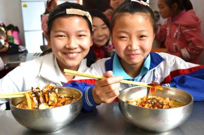 (图3):4月24日,湖北省郧县柳陂镇中心小学两女学生正在学生餐厅开心食用“香汁鸡丁”和“鱼香肉丝”,学校后勤服务标准化了,山里孩子们的舌尖“美”起来了。