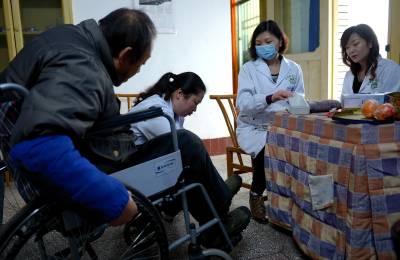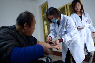 4月25日,宣恩县珠山镇工农街社区卫生服务中心的医护人员在园艺村为瘫痪村民安勇检查身体。