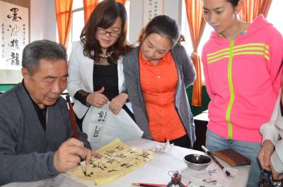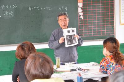 “学习毛笔字是七分看,三分写,练习时要进入无我境界。”鲁老师给老师们上书法课,从笔、墨、纸、砚的了解,到亲自示范如何握笔、运笔,指出“学习书法一定要循序渐进,多看,多悟,多练习,多变通,功力日深,就可脱胎换骨,创出自己的风格来”。