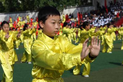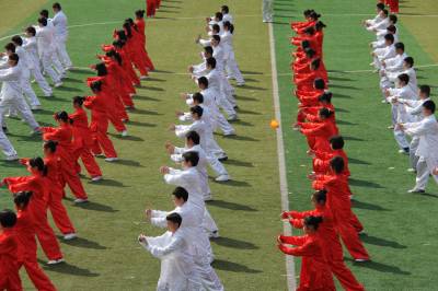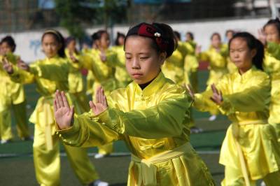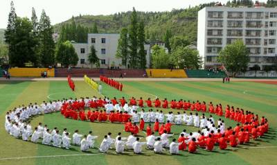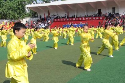 4月26日,丹江口市第七届中学生田径运动会及武当武术比赛开幕式在市一中田径场隆重开幕,来自全市初中、高中的22支学校代表队、352名运动员,参加13个项目为期两天的角逐。这是该市落实“健康第一”的思想,进一步推动“阳光体育运动”的一项重要活动,也是对中学生们竞技水平和健康水平的一次大检阅。图为学生在进行武当太极拳表演比赛。本报视界网 钱 芹/摄