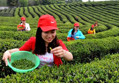 清明时节,六虎山农庄茶园茶农喜采春茶。由于今年季节推迟,石首市团山寺镇六虎山农庄茶园800多亩茶树碧绿、新芽初绽,春茶比往年推迟上市半个多月。(倪隆广 摄)