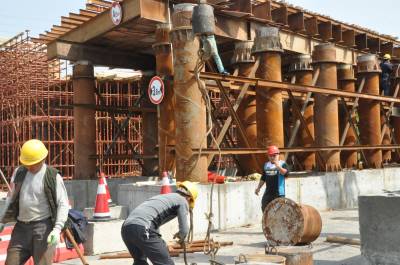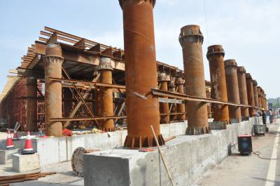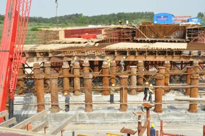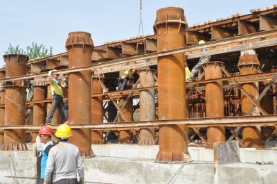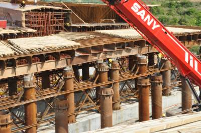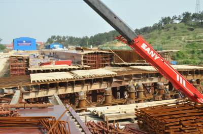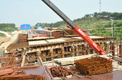 4月27日,麻(城)竹(溪)高速公路红安段桥梁建设工人们正在捆扎桥梁钢筋、铺设模板,加紧推进桥梁建设(见图)。麻竹高速公路红安段全长42.999km,双向四车道,路基宽度26米,设计时速100公里。全线的控制性工程有:宋埠枢纽互通、倒水河大桥、桃花互通、红安互通、东大河大桥。本报视界网耿红元摄