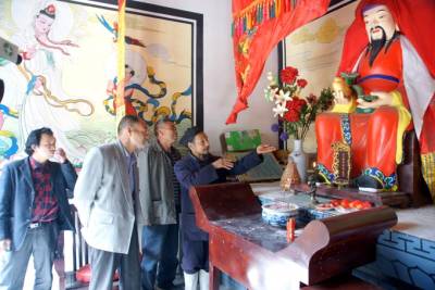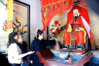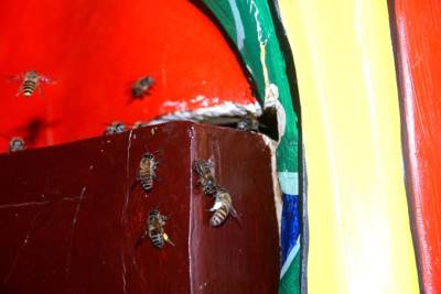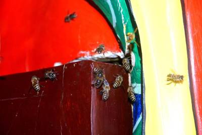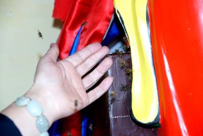 4月28日讯(袁 野):“蜜蜂飞来建巢,象征甜蜜吉祥。”昨日,笔者来到十堰市茅箭区赛武当泰山观景区,只见一只只嗡嗡欢快的密蜂,带着一“蓝蓝”黄灿灿的花粉团,穿流不息地飞往财神殿财神爷的樟木坐箱里。吸引香客游客无不惊奇观赏,连连称赞“蜜蜂钻进财神爷‘身内’, 和谐相处,真是吉祥如意。” 赛武当,位于十堰市茅箭区小川乡境内,东与道教圣地武当山翘首相望,因山比武当山天柱峰高112米而得名,南连万山叠翠的诗祖尹吉甫故里房县。它气势磅礴,峰峦叠嶂,松、石、云、雾、霞,蔚为奇观,被列为国家级自然保护区。 赛武当泰山观,位于相传李自成屯兵的营子村,古有泰山观,后年久只剩遗迹,2010年复建,有祖师殿、药王殿、财神殿等。景区周围古树苍劲,丹桂葱翠,河水碧绿,清沏涟漪,悬崖峻峭,巨石奇特,一峰如“寿星老人”。 据赛武当道教协会会长李长久介绍,“万物皆有灵, 蜜蜂感灵气。2013年,八月中秋之季,泰山观院内八株丹桂飘香,一日上午,突然一群蜜蜂,约数万只,嗡嗡飞来庙观, 开始聚集在财神殿房檐下,绣约蓝球大一个圆陀,道众惊喜不已。谁知,一会儿一些蜜蜂却飞进财神殿内,钻进财神殿内的一尊文财神木雕像里面。原来这蹲财神像所坐的樟木箱‘坐凳’,有一道高1cm、长60cm的缝隙, 樟木的香气引得蜜蜂纷致入箱筑巢,房檐下的蜜蜂都飞进财神像‘身内’, 飞出飞进,春夏秋季节采花酿蜜,冬天在里面冬眠。蜜蜂与财神爷和谐相处,也就与庙观道众和谐相处,也成为香客游客的‘吉祥如意’ 的奇观。” 年过半百的顾崇林道长说:“这尊木雕财神像高1. 60cm,坐凳(木箱)高60cm , 宽60cm , 长90cm , 坐凳成了蜜蜂巢。道人讲究道法自然,天人合一,上善若水,大道之善, 造福人民。而蜜蜂寓意代表团结和勤劳,象征吉祥。去年中秋以来,数万只蜜蜂的到来,不仅与我们道人和谐相处,增添了生活的情趣,而且也成为香客游客的一道珍奇景观。