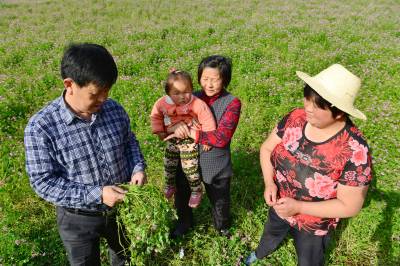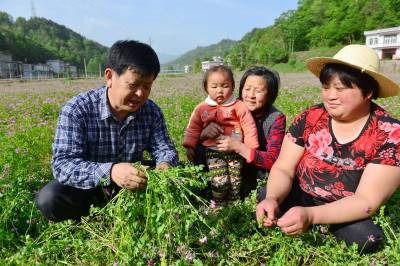 4月28日,建始县三里香米专业合作社理事长解维年与社员在长满红花草的稻田里了解“绿肥”长势情况。三里乡素有“建始粮仓”之美称,近些年由专业合作社带领农民种植的万亩香米走进超市,闯入市场。去年该专业合作社开始用农家肥试种有机稻成功,今年指导部分专业合作社社员种上红花草,大家都叫它“绿肥”,耕田时直接作为有机肥使用,既省工,又能提高肥力,实现水稻增产保质增收目标,种植观念不断更新,深受当地农民欢迎。本报视界网刘波、钱坤摄