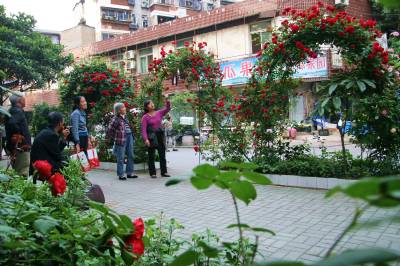 昨日,在江汉区常青三院43栋一单元门前,易桂梅女士正在向邻居们介绍自己种植藤本月季的经验。据了解,易女士酷爱养花,近年来在房前屋后栽种了茶花、朱顶红等30余种计200余盆花卉,她还将扦插的100余株花苗赠送邻里和爱花QQ群网友,与其交流养花心得。目前,她扎制的藤本月季拱门已成为常三社区一景,吸引了众多路人的眼球。 张垠 摄 武汉市江汉区园林局 430022