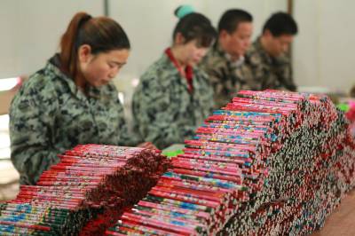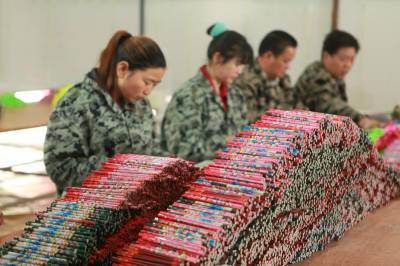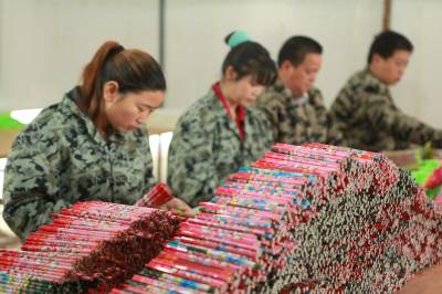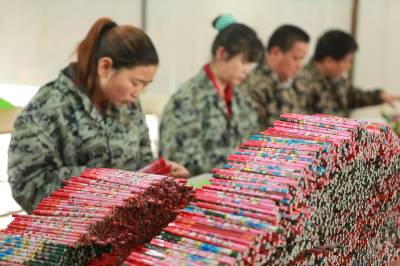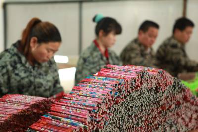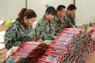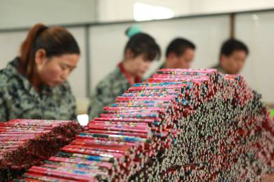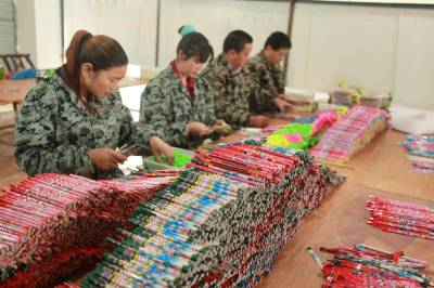 环保铅笔俏市场 4月30日,位于竹山县上庸镇移民小康建设培训基地的文状元环保铅笔发展有限公司员工正在生产铅笔。该公司生产的“文状元”牌环保铅笔以废旧报纸为主要原料,既保护了生态环境,又创造了财富。该公司产品远销美国、俄罗斯等10多个国家和地区,年产值达1200万元。(本报视界网 章磊 摄)
