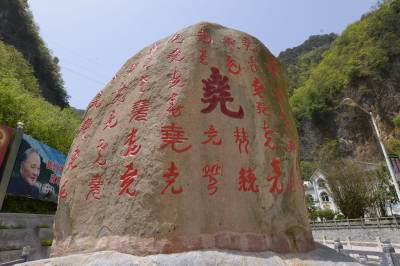 “百尧石”高3.6米、宽3米,收集古今书法中的100个“尧”字,集行、草、隶、篆等各种字体为一体,为全国最大的“尧”字书法雕刻奇石。