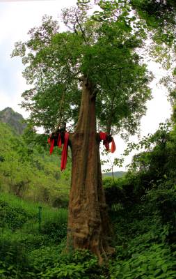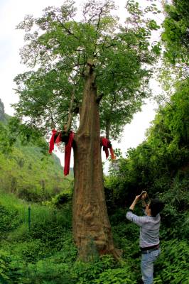 4月29日,一位林业工作人员在三峡库区湖北省巴东县茶店子镇的一颗1500年树龄的南紫薇树前拍照,收集资料。