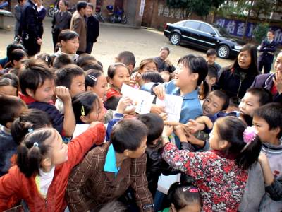 ”不要抢,人人都有份。”4月12日,竹山县潘口乡潘口河村小学内,社会课老师正为近百名移民学生发放”心理家园”读本。该县针对潘口水电站建设近万名移民学生普遍存在的精神上缺乏寄托、人际关系需要重新建立、新的生活环境需重新适应等问题,将各乡镇风土人情、民俗风物和生活习惯等内容以图文并茂的形式汇编成”心理家园”读本,使移民子弟加快”适应新环境、投入新生活”步伐。(通讯员 石濡华罗传明 摄)