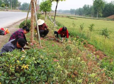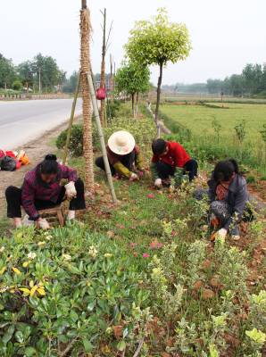 建管并重 绿满谷城 5月5日,全县绿化示范村——冷集镇塔湾村农民正在管理新栽上的树木、花卉。谷城县冷集镇在实施“绿满谷城”行动中,共栽种常用年风景树等40万株。该镇成立专班,对新栽种的树木、花卉采取了缠草绳、包防护膜、扎保护桩、搭遮阳棚、浇水除草、松土等有效措施,确保成活率。 本报视界网马明刚摄