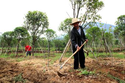 红绿辉映奔富路 黄梅县苦竹乡、五祖镇、大河镇等乡镇共引资近亿元,在大别山红色旅游公路黄梅段沿线建立5000余亩的花卉苗木科技产业带,采取“公司+基地+农户”的方式,带领山民发展绿色产业致富。图为黄梅县苦竹乡张享堂村村民在黄梅现代林业花卉苗木科技产业园里务工。 (本报视界网 王政 摄)