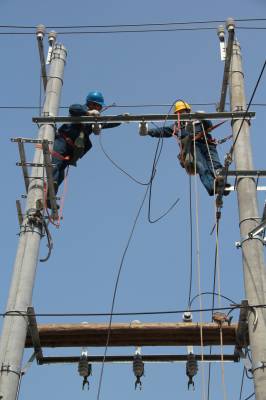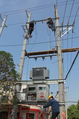 5月5日,湖南鸿瑞电力施工队在安陆市王义贞镇吉庙村进行农网改造。为改变该市偏远乡村用户电灯昏暗,农业抗旱电压过低等现状,该市今年投资近百万元对全市103个村426个组进行升级改造,此项工程惠及百姓愈15万。 (本报视界网 王代金 陈锐 摄)