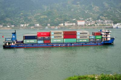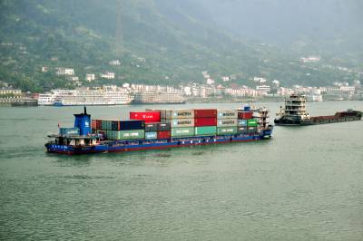 2014年5月1日,一艘装载集装箱的货船行驶在长江西陵峡的宜昌市夷陵区乐天溪段江面。长江干线货运量目前已接近20亿吨,位居全球内河第一,为密西西比河、莱茵河的4倍和10倍。2013年,长江干线货运量达19.2亿吨,同比增长6.7%,再次刷新世界内河航运纪录。这是长江干线年货运量连续第9年居世界第一。2005年长江货运量首次超过美国密西西比河、欧洲莱茵河,由原来的世界货运量第三位跃居首位。