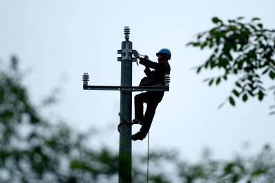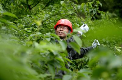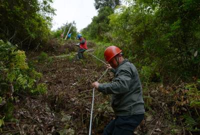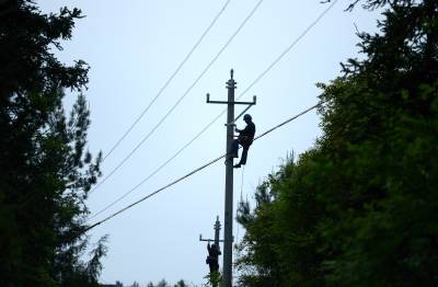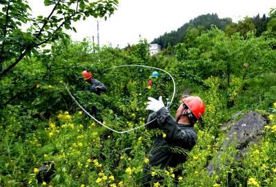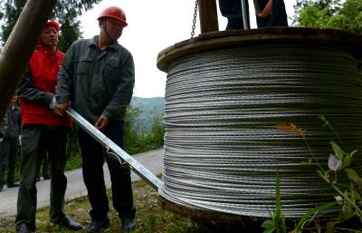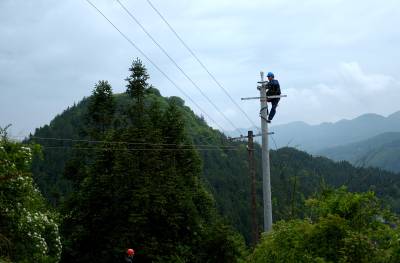 5月5日,国家电网宣恩县供电公司员工在黄坪村架设10千伏进村线路。