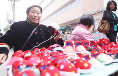 昨(12)日,在荆门市城区一家鞋帽市场,黄婆婆在向市民推销自己纳制的婴儿软底鞋。本该是享清福的年纪,在这个市场,每天却有10多位六、七十岁的婆婆将自己纳制的婴儿软底鞋摆上摊位,供市民选购。这群闲不住的婆婆不论刮风下雨,每天早晨7时出门,晚上6时收摊回家。苦中寻乐的黄婆婆自豪地说”我靠双手每月能挣600多元哩!”(本报视界网宁新生摄)
