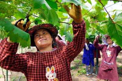 鄂州市峒山葡萄园占地180亩,由峒山村农业发展公司筹资建设,利润归村级集体经济所有。该项目定位于打造精品旅游观光农业,内部各细节均体现着人性化设计,葡萄架高1.6米,树木两列间宽3米,两株间隔1.5米,便于顾客以舒适的角度走进园内观赏、伸手即可采摘。十类国外引进的改良品种葡萄混杂种植,体现美观的同时,给顾客提供多样化选择。预计,该基地葡萄6月中旬成熟。图为,5月6日,农民在园内剪枝。 郑博 摄
