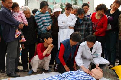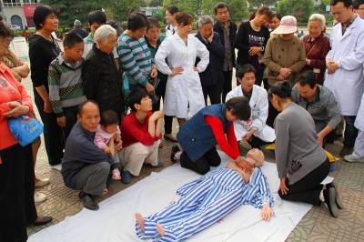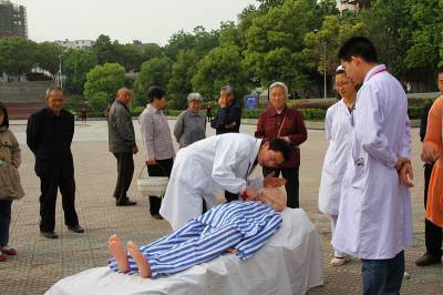 5月8日是第67个世界红十字日。当天,郧县组织十余家医疗卫生计生单位在郧阳文化广场开展免费医疗技术服务,向市民宣传健康知识,进行急救演练,提高市民的急救和自救能力。图为市民在医务人员的指导下进行现场急救练习。 郧县卫生计生局:李 波 电话:13733539143