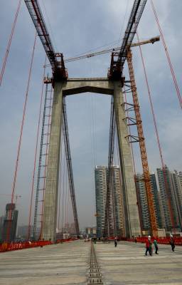 5.8.我采访了正在施工的武汉鹦鹉洲长江大桥。据大桥建设指挥部办公室韩主任介绍:武汉鹦鹉洲长江大桥位于湖北省武汉长江大桥上游2.3公里,距上游规划杨泗港过江通道约3.2Km,距白沙洲大桥6.3km。本桥北接汉阳的鹦鹉大道,南连武昌的复兴路。鹦鹉洲长江大桥为武汉市的第八座长江大桥,主桥面为双向8车道。是世界首座主缆连续的三塔四跨悬索桥;也是世界在建同类桥梁中跨度最大的三塔四跨悬索桥;此桥于2010年8月开工建设,计划于今年年底通车。目前桥面正在为"刷黑"作准备。这是我今天拍摄的一组照片: