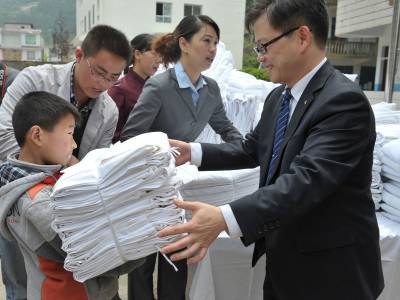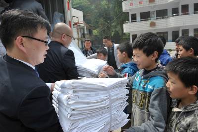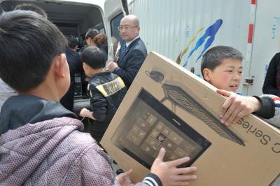 5月8日,恩施市沙地乡黄广田希望小学师生在领取恩施富源国宾酒店赠送的床上用品和电脑。当日,恩施富源国宾酒店向黄广田希望小学赠送10台电脑和150套床上用品,用于改善学校教学条件和学生住宿条件。
