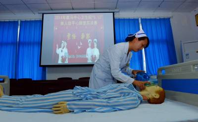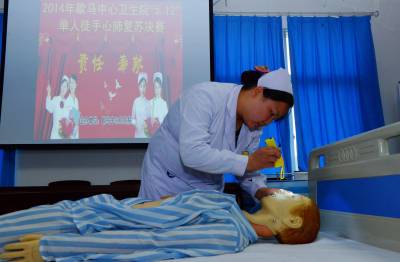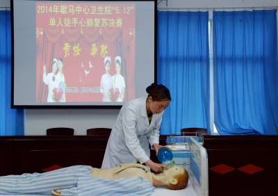 5月10日,保康县歇马中心卫生院的护士在进行单人徒手心肺复苏演示操作。 当日,保康县歇马中心卫生院开展护理操作技能竞赛,来自该院各科室的12名护理人员代表进行护理操作技能大比武,交流学习护理技能,通过这种方式迎接即将到来的国际护士节。 (本报视界网 陈泉霖 伍平 摄)