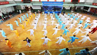 嘉鱼县举行第五届中老年人太极拳剑比赛 11日嘉鱼县举行第五届中老年人太极拳剑比赛,来自全县10支代表队共200多名运动参加比赛,经一天35场赛,陆溪镇藕塘村获集体二十四式太极拳和集体三十二式太极剑冠军,文庙山二队获集体四十二太剑冠军。 图为全体运动员集体表演二十四式太极拳 嘉鱼电视台雷平
