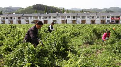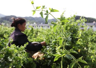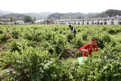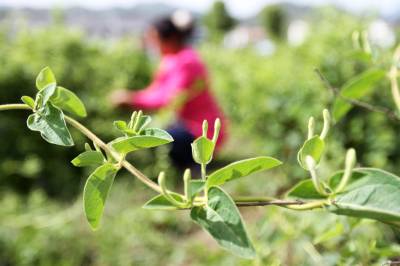 香味药材助农增收 5月11日,村民在竹溪县秦巴药谷晨康药业有限公司药材基地采摘金银花。当日,竹溪县秦巴药谷晨康药业有限公司药材基地1000余亩既可入药又可饮用还可观赏的金银花开摘。该公司采用公司、基地、合作社、农户相结合的农业产业化经营模式,先后在蒋家堰镇黄石头、洞沟河、关垭子等6个村流转土地,连片种植金银花、牡丹、贡菊、芍药、玄参等中药材5000余亩,药材产业促进农业增效,还带动旅游、农家乐的发展,多途径促农增收。