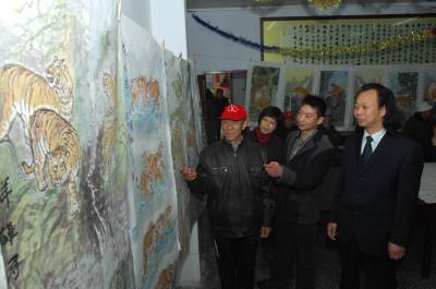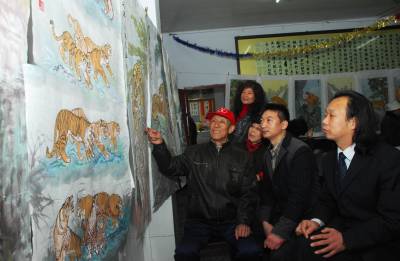 4月13日,72岁的画师王开容老人创作的72幅虎图在襄樊寒山人书画学校展出,请书法界朋友点评,用绘画的方式为上海世博会喝彩、助兴。 据王开容老人介绍,从一年前他就想用一种方式为上海世博会助兴,想到今年是虎年,他就开始创作老虎图,在一年多的时间里,他画了数百幅,这次精选了72幅共113个形态各异的虎图,在虎年为上海世博会助兴,喝彩。寒山人学校得知这一情况后,为老人提供了展览场地。 他希望这些绘画在襄樊展出,让市民感受到世博会的氛围。