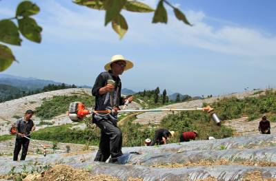 机器打孔效率高 5月12日,咸丰县高乐山基地单元小模村2组村民吴秀明在膜上打孔。该县将近40万元,其打孔效率至少是在常规打孔器5倍以上的200多台肩挎式手持打孔机投入到11个乡镇的农业生产种植专业户手中,让他们轻松劳动,加快了生产进度,提高了打孔质量。 本报视界网 周方奎 摄